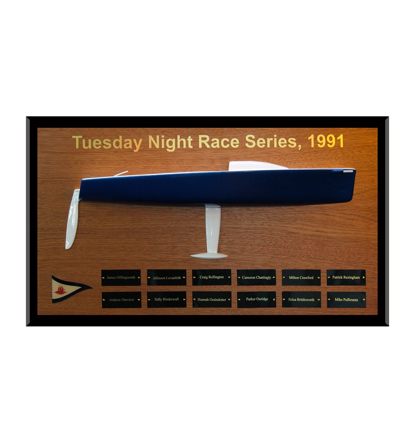 Discover this wondrous half hull trophy of the Melges 24, fully customized with your yacht club burgee, brass plates and a golden title, so built upon request at scale 1/16 or 18 inches LOA.