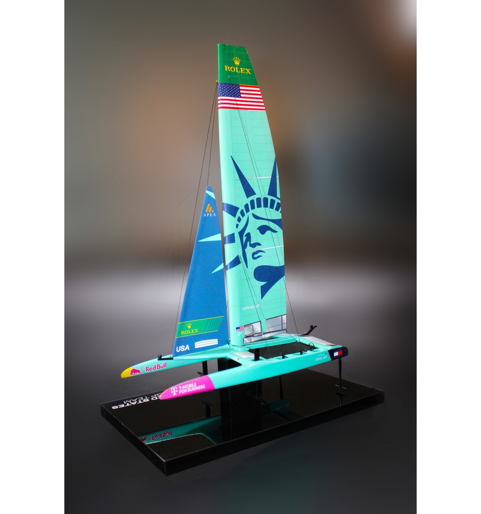 These F50 high-end desk models are made of resin, photo-etched parts, acrylic base and North Sails fabrics and come with a support and Plexiglas cover.