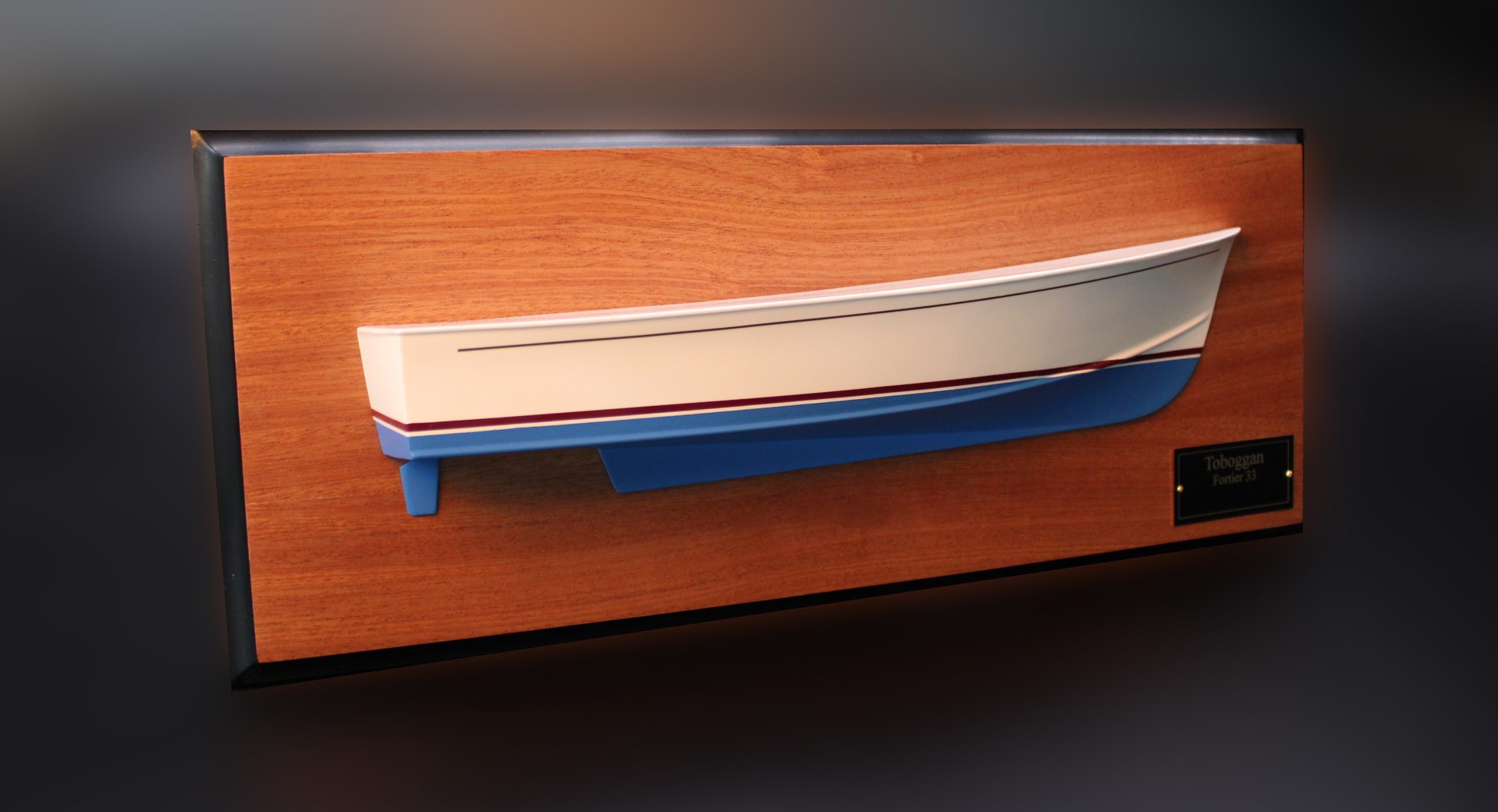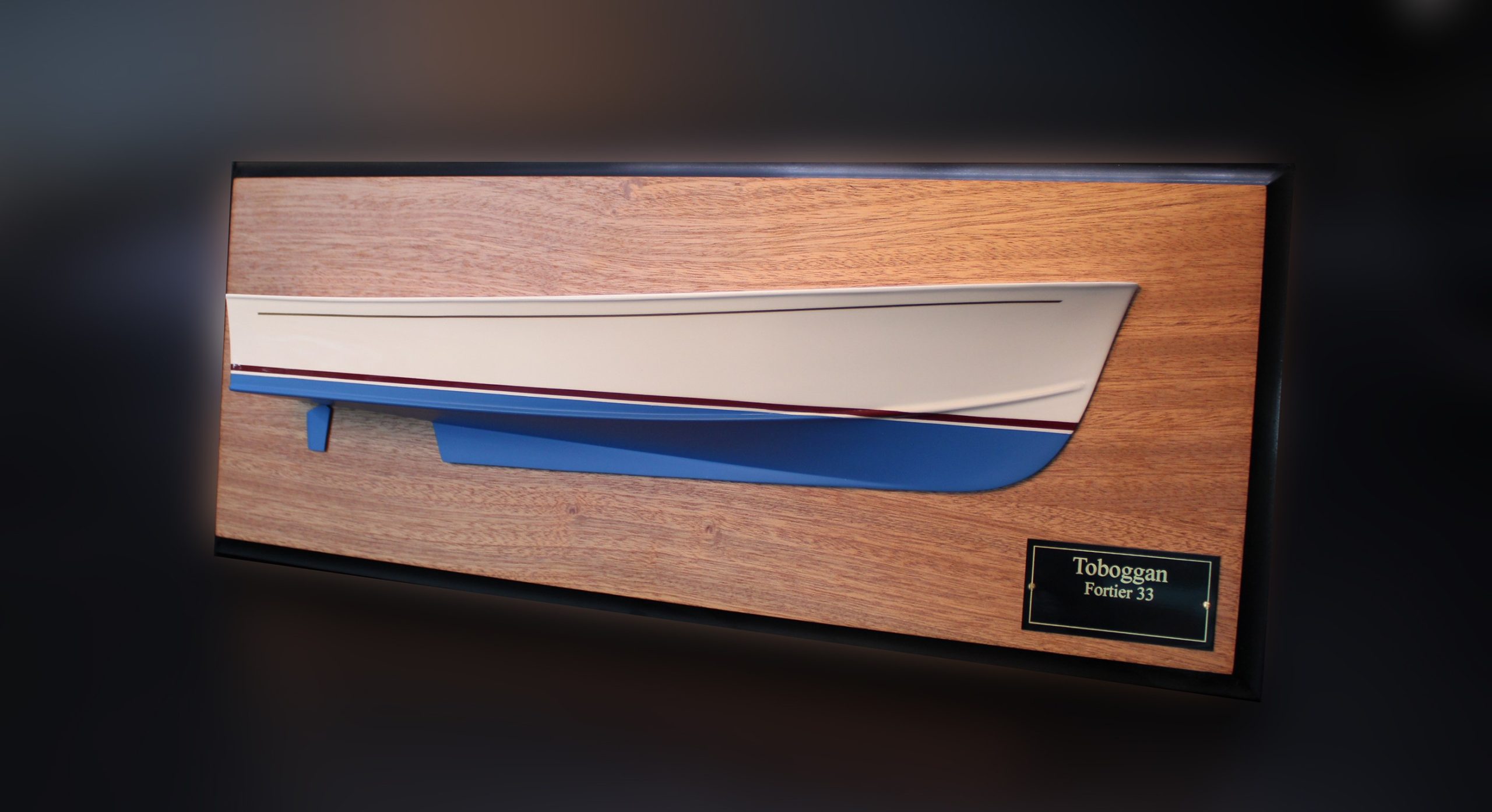 Observe this alluring custom half hull of the Fortier 33, built upon request at scale 1/24 or 16,5 inches LOA.