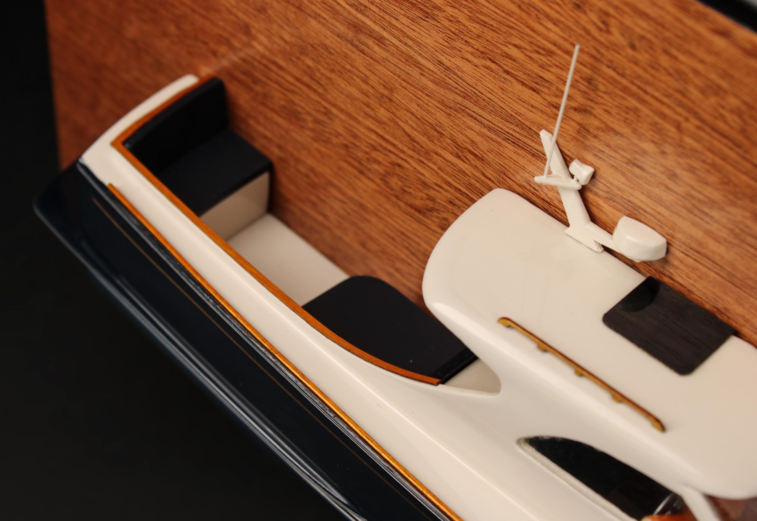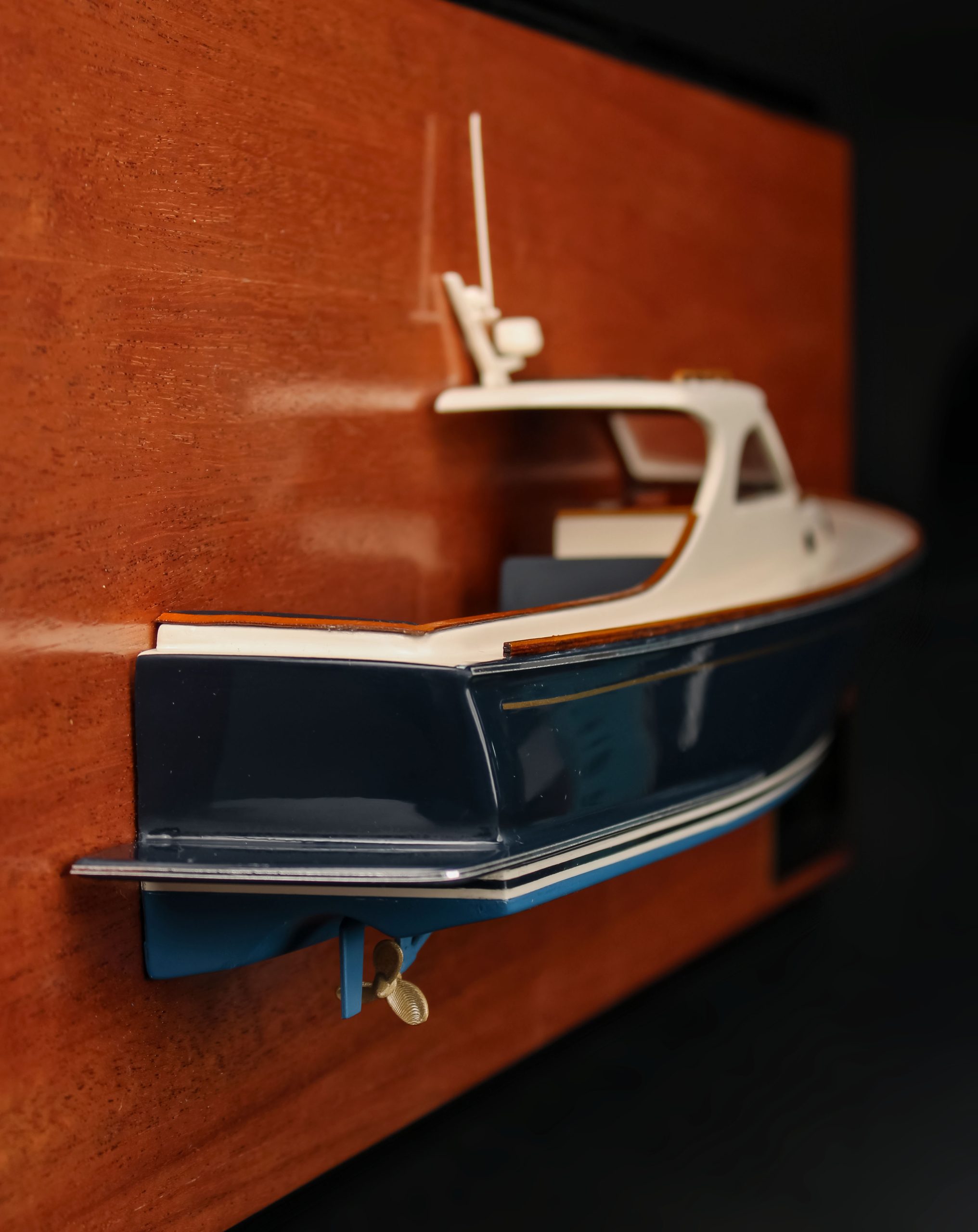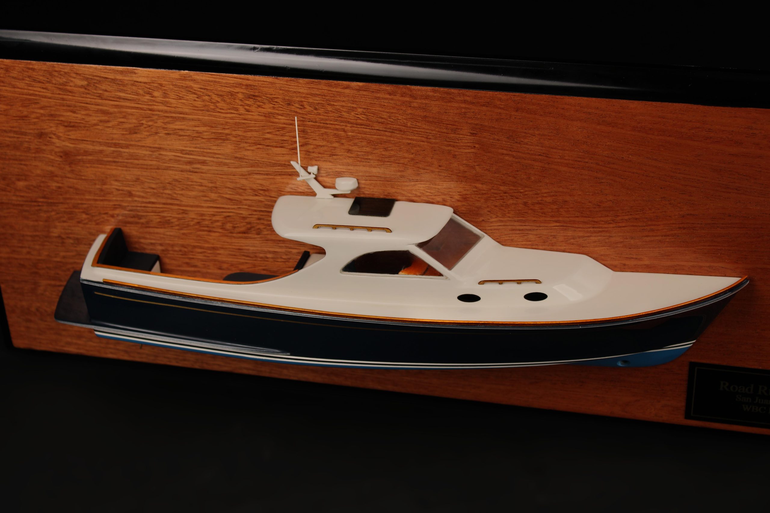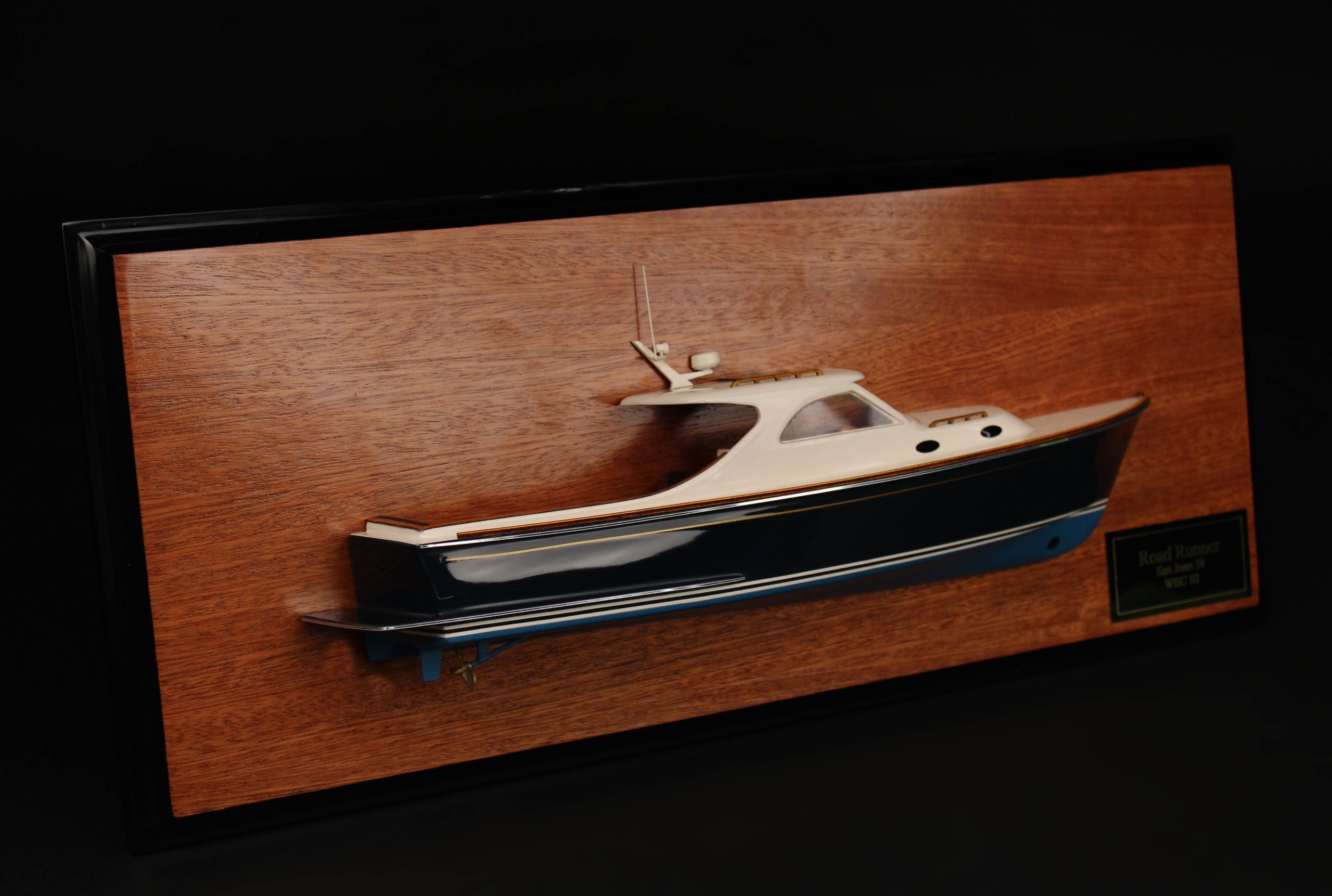 Handcrafted wooden half hull model of the San Juan 38 “Road Runner”, built to a 1:32 scale with a 14″ length overall. A classic custom half model, faithfully reproducing the lines of this iconic power boat. Perfect for collectors, nautical enthusiasts, and maritime décor.