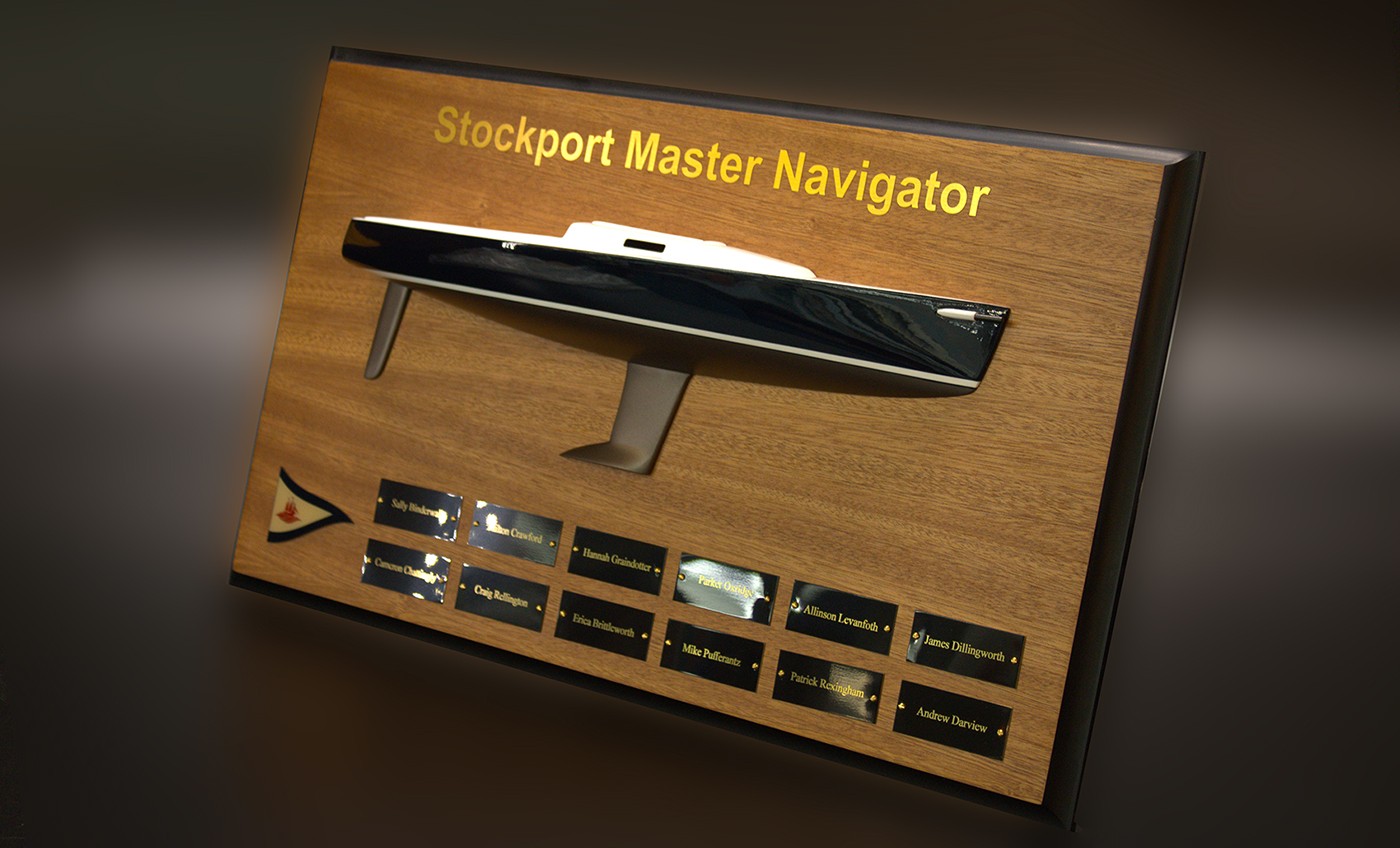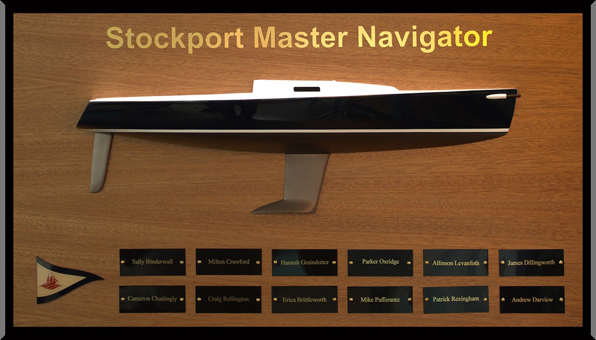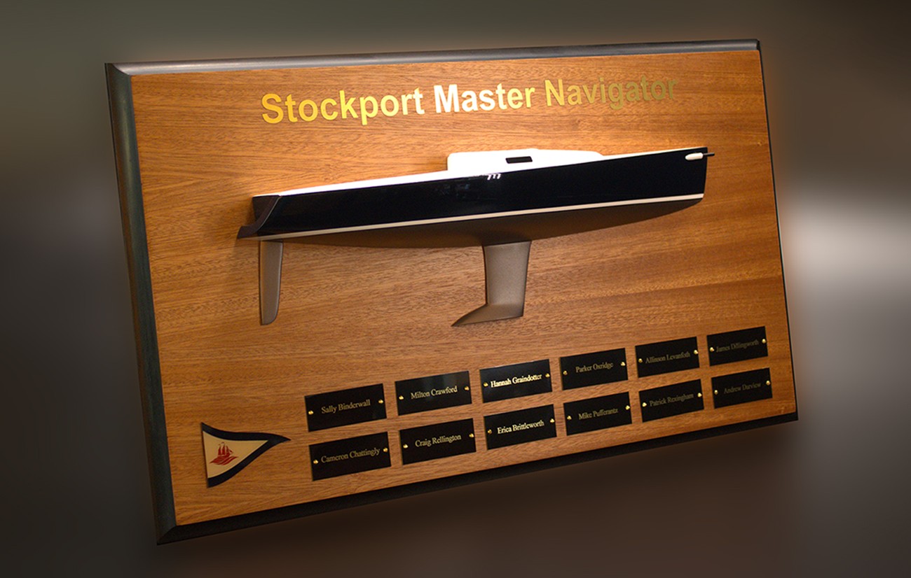 See this handsome trophy of the J–100, built upon request at scale 1/24 or 17 inches LOA., with your yacht club burgee, brass plates and golden title.